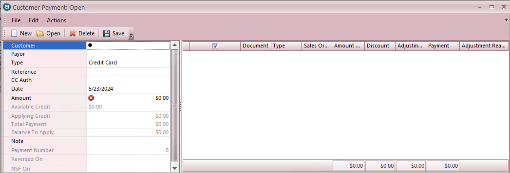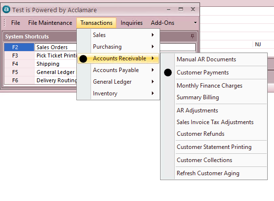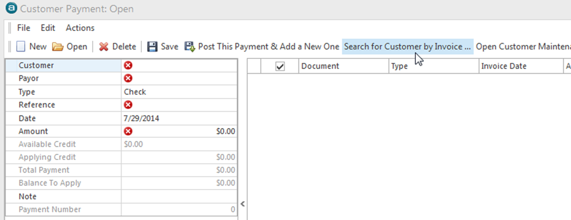 Find Customer by Invoice by entering the invoice number and hitting the Enter key. When the invoice displays, hit enter again and it will bring you back to the Customer Payment screen with all open invoices for the associated Customer displayed OR in the search screen simply highlight the correct customer and hit Enter, which will bring you back to the Customer Payment screen.