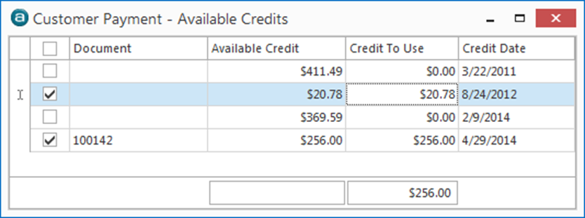 SELECT CREDITS TO APPLY to this payment. Click on the icon to display list of credits, then Check box on the line of the credit, or overpayment, that is applicable. Close the credit list box and the running totals for Available Credit and the Balance to Apply will have changed by the amount of credits selected.