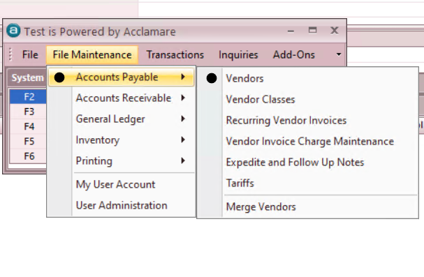 - File Maintenance > Accounts Payable > VENDOR